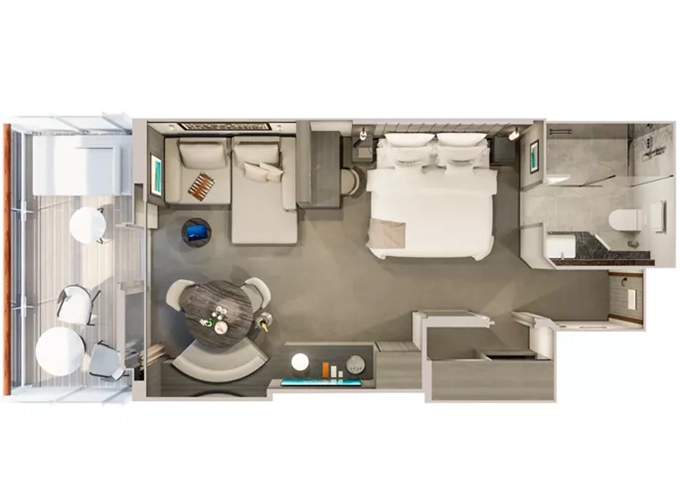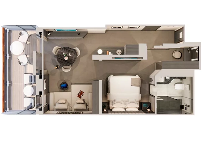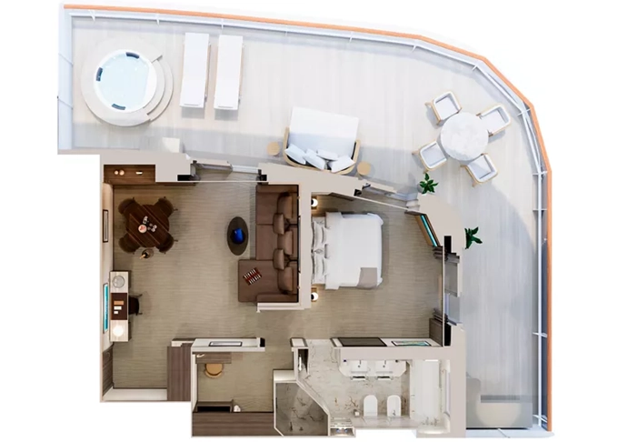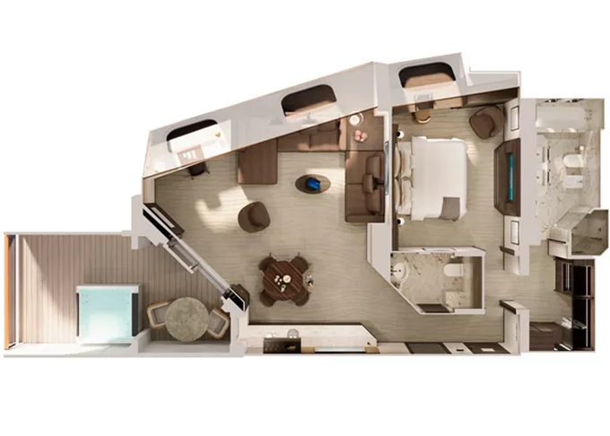 | Retreat Residence Suita 63 m² + Terasa s vírivkou a sedením 14 m² / 7. paluba: 18 m². Spálňa s obývacou a jedálenskou časťou, šatník. Koktailová súprava, minibar, kávovar, vodná kanvica, ďalekohľad, sejf, mramorová kúpeľňa s vaňou a sprchou, extra wc. Taška Technogym Case Kit. Fľaša šampanského na privítanie. Služby osobného majordóma. Maximálna kapacita 3 dospelí alebo 2 dospelí + 2 deti pod 18 rokov. | 12 855 € 4 285 € za osobu | ||
