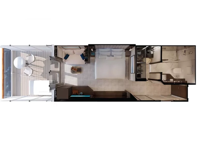 | Ocean Residence - Cove Residence Suita + terasa so sedením a lehátkami 56 m². Spálňa s obývacou a jedálenskou časťou, šatník. Koktailová súprava, minibar, kávovar, vodná kanvica, ďalekohľad, sejf, kúpeľňa so sprchou. Závesy, svetlo, klimatizácia ovládané smart technológiou. Taška Technogym Case Kit. Fľaša šampanského na privítanie. Maximálna kapacita 3 osoby. | 18 540 € 4 635 € za osobu | ||