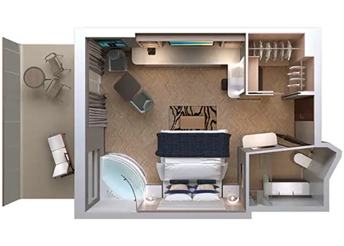 B1 - Kajuta s balkónom Aft-facing od 20 m² / balkón od 3 m². 9. až 15. paluba. Max 2-3 osoby. 5 208 € 2 604 € za osobu